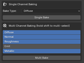 Note: this addon is not very optimized and baking is very resource intensive. It may seem like it's hanging but wait for the bake button to turn from blue to gray. Then you know it's done.